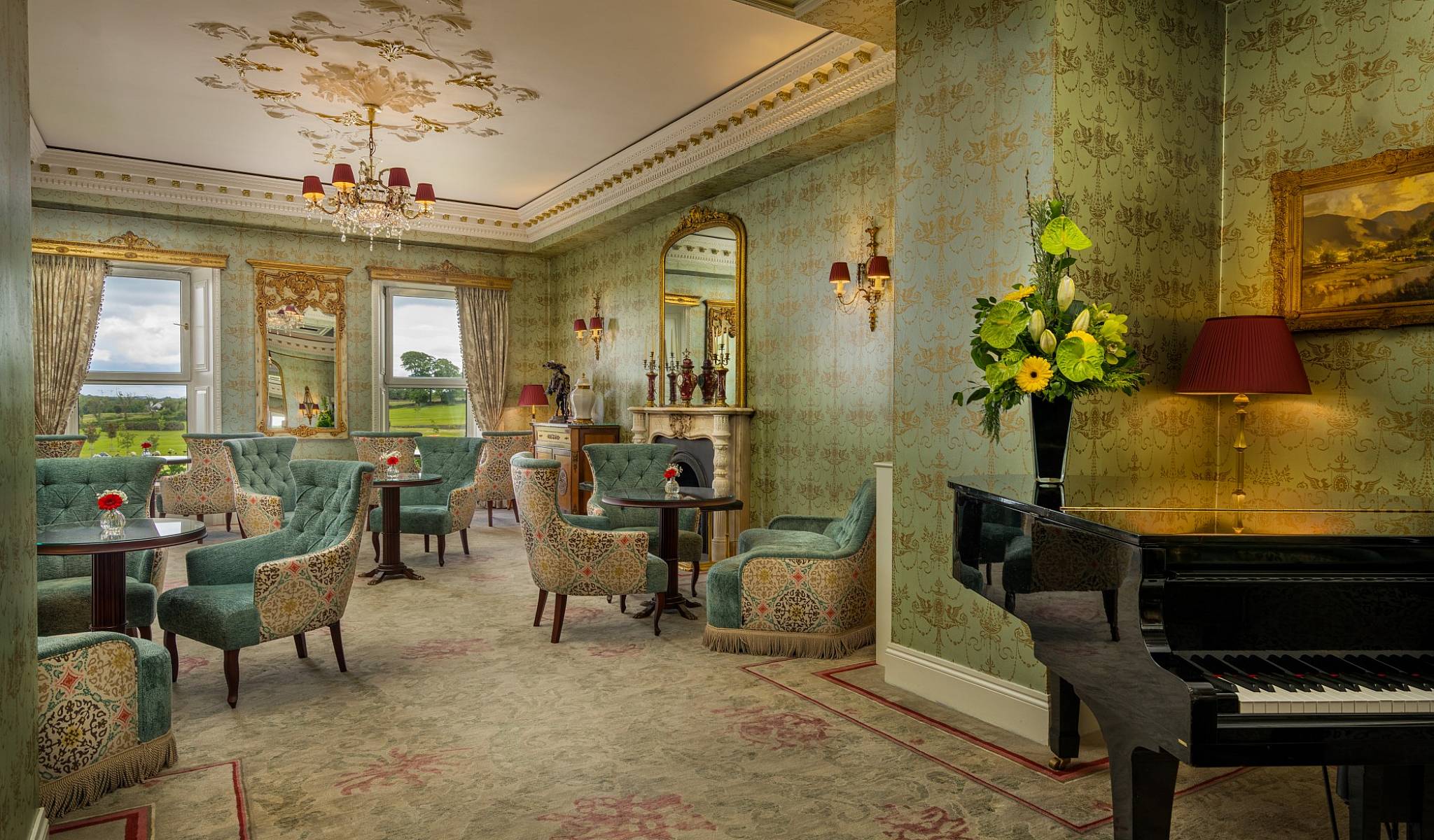 Glenlo Abbey Hotel & Estate offers superb dining and entertainment options for both formal and informal occasions. The main house features three elegant reception rooms that exude old-world charm, ideal for afternoon tea, pre-dinner drinks, or simply unwinding. The recently restored stone-cut Abbey provides a serene retreat, while the Corrib Suite boasts panoramic views over the estate and lake, making it a picture-perfect setting for fairy-tale weddings.